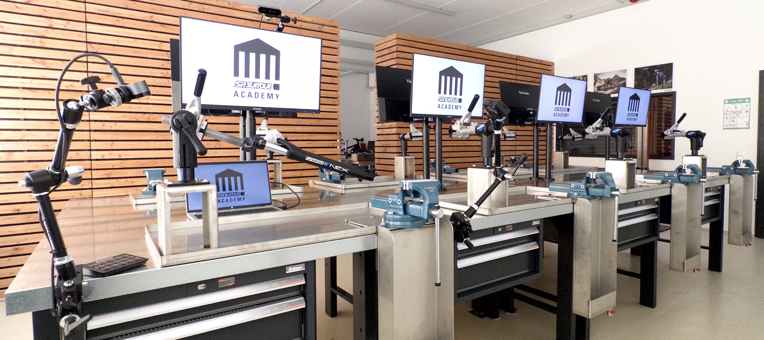 Lehrmittel: Arbeitsplatz mit Gabelhalter, Dämpferhalter und Standard- sowie Spezialwerkzeugen für jeden Teilnehmer